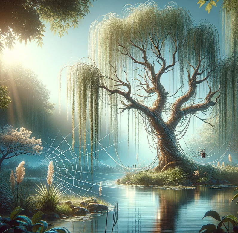 By day, the spider slept hidden in the corners, but at night, it wove a silver web along the willow’s branches. As the tree browned and its leaves became sparse, the spider’s web served as a consoling dress during the long, hot days and nights. The willow waited eagerly for the spider’s stories and songs, finding solace in its nocturnal activities.
